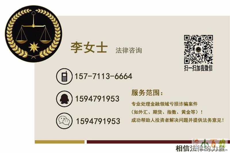 我们是法律咨询团队经验丰富,有多种渠道进行技术亏损挽回,四加一模式成功率高,誉鑫国际已经有成功案例,尽快处理,时效性会更高,成功机率就越大!外汇、指数诈骗案子层出不穷,违法途径暗箱操作。依据我国法令法规,在不合规不合法途径操作被骗的资金,都是可经过正当的亏损挽回追回资金的,经验丰富的咨询团队,法律咨询亏损挽回能以最快的速度挽救亏损资金!不论你是在股票、现货、邮币卡、大宗产品、外汇等亏损或不让出金均可联系法律咨询李女士!
